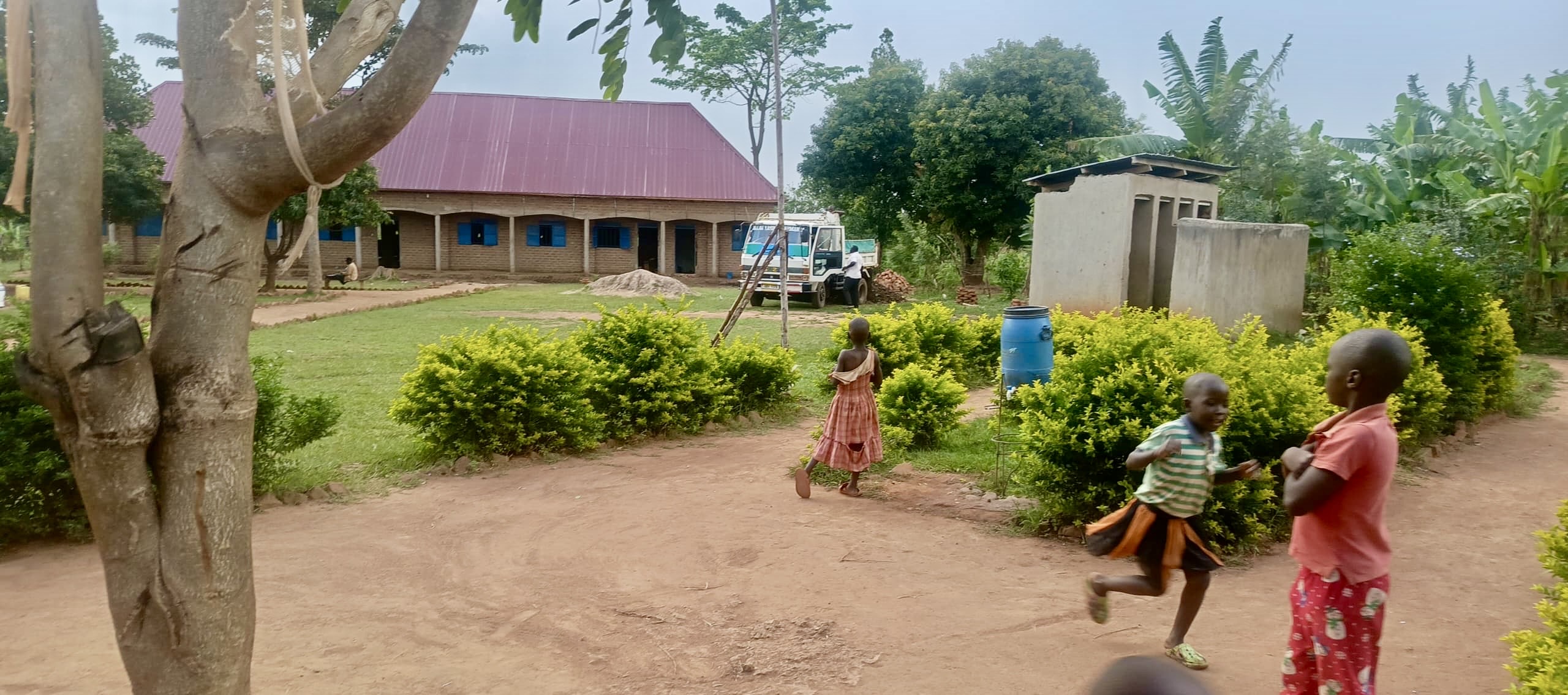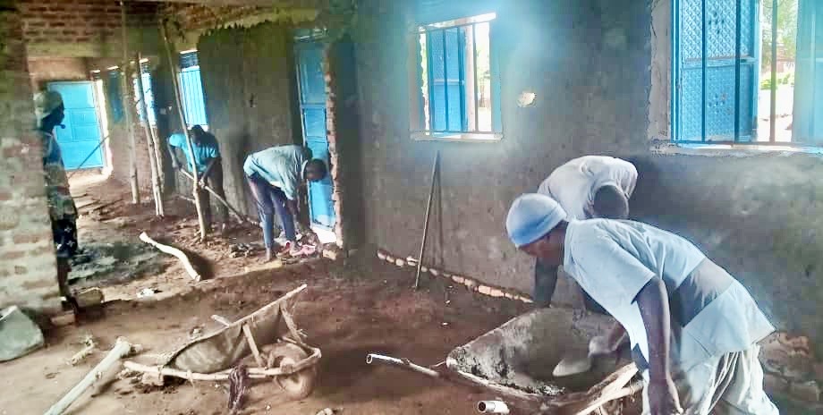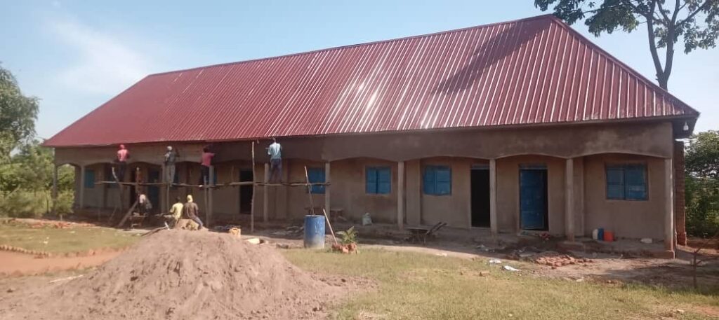 Bereits im August war der Rohbau des neuen Schulgebäudes fertig und das Dach gedeckt. Obwohl Böden und Putz noch fehlten, wurde der Rohbau zum Teil auch schon genutzt — etwa bei großen Versammlungen oder Prüfungen. Nun können endlich auch die restlichen Innenarbeiten in Angriff genommen werden: Derzeit erhalten alle Räume einen festen Betonboden, die Wände werden verputzt und zuletzt innen und außen gestrichen.